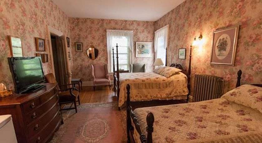 Located on the second floor, this spacious room features a queen bed and a twin bed. Seating areas include three reading chairs, plus WiFi access, a flat-screen TV, and a small fridge. Private bathroom facilities are across the hallway.
